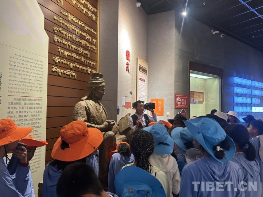 圖為雪豹隊隊長洛桑平措在展廳為營員們講解藏文的起源歷史
