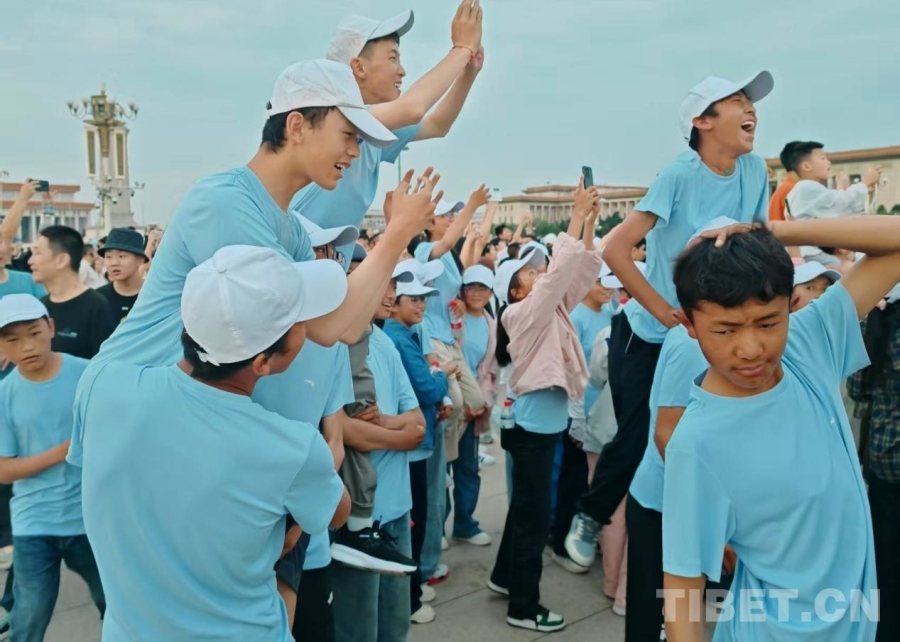 圖為參加“山河同脈·京華筑夢”研學(xué)活動的西藏日喀則定日縣中學(xué)生們在天安門廣場 攝影:張?jiān)?/p>