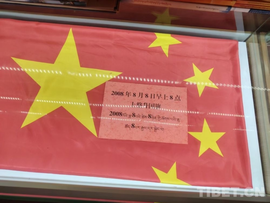 圖為古曲扎巴老人珍藏的2008年8月8日早8點(diǎn)所升的國(guó)旗 攝影:王東