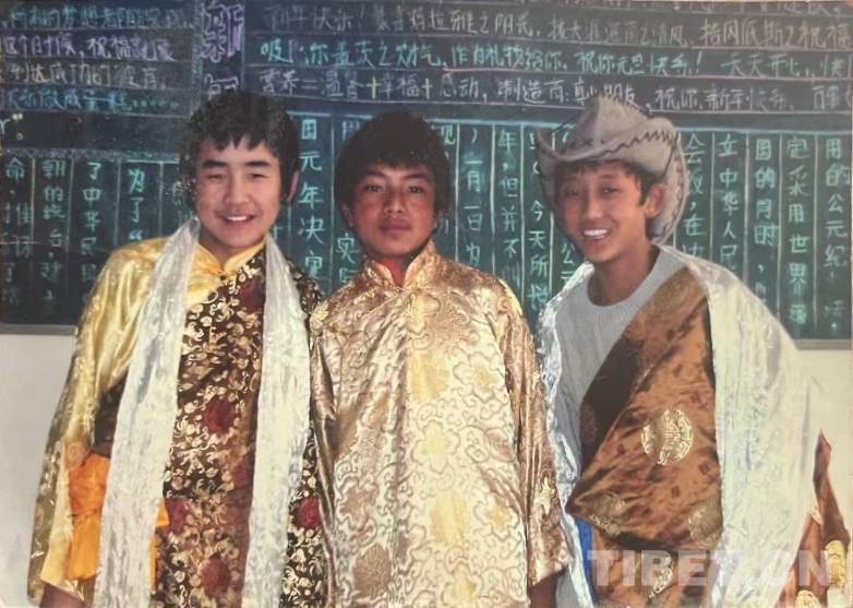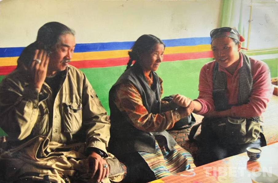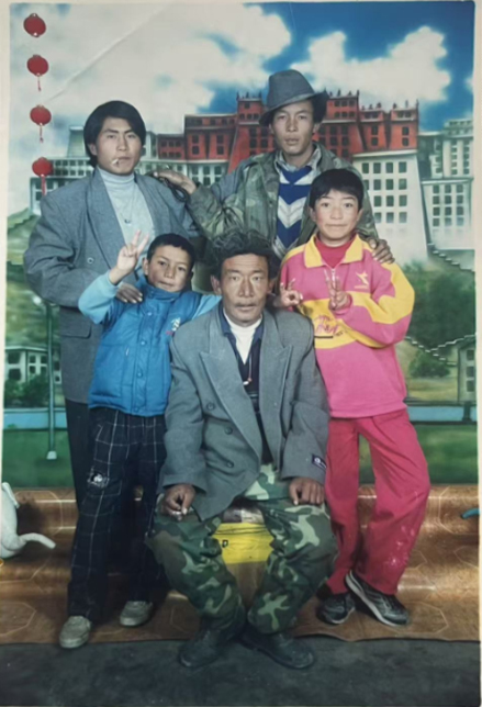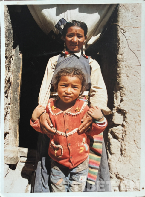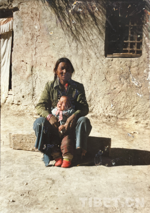 這是在我們家老房子門口照的。那時(shí)候全是土坯房,這間是四間房里最大的。大概是1990年左右。記得穿的這身衣服那些年很多人都穿,應(yīng)該是軍裝,穿著這衣服騎馬去挖藥很多次。人民公社時(shí)期我們有八個(gè)生產(chǎn)隊(duì),那時(shí)候要采藥掙工分,偶爾拉薩藏醫(yī)院的老師們會(huì)專程來札達(dá),我們也要幫忙去采藥。這邊藥材很多,如雪蓮花、黃連、蒂丁等。拍這張照片時(shí)孩子的鞋和幾件衣服是我自己織的,但要買好衣服還得去阿里地區(qū)。那時(shí)我丈夫已經(jīng)在開車,我們家條件稍好些,但也不是村里最好的。