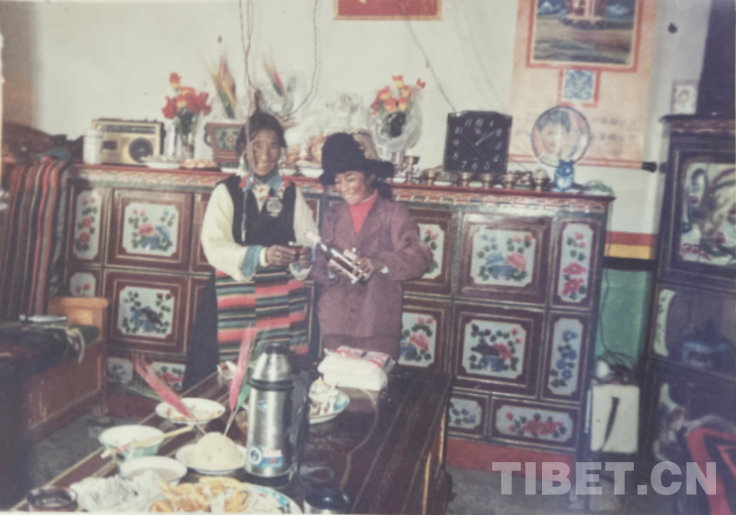 照片中是我和二女兒。這是拆了前一張照片里的老房后新蓋的房子,比以前大,質(zhì)量也好。這是過年時(shí),女兒正給我倒果啤。哈哈哈!過年時(shí)每家每戶會(huì)準(zhǔn)備兩個(gè)“切瑪”,大的要供在高處,另一個(gè)則是來客人時(shí)敬客用。那收音機(jī)也是個(gè)老收音機(jī),我喜歡聽新聞,用這個(gè)聽過很多中央新聞。這時(shí)我們村通了電,也通了水,每家門口都有自來水,札達(dá)縣有發(fā)電站。2015年政府還給衛(wèi)生院蓋了新樓。