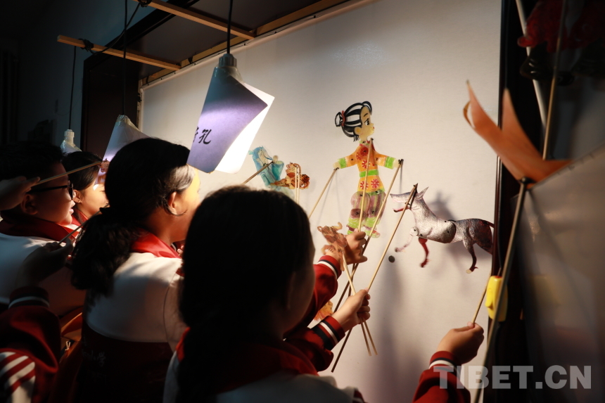 圖為孩子們?cè)谀徊记绑w驗(yàn)皮影戲演出過(guò)程 攝影:劉莉