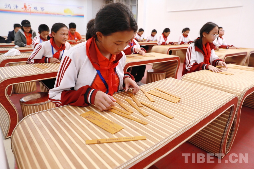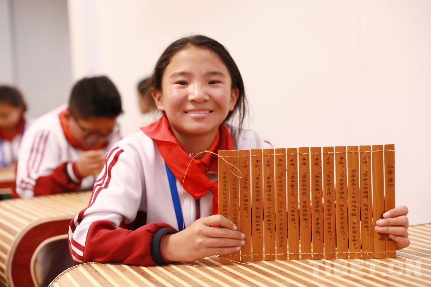 “子曰:‘學(xué)而不思則罔,思而不學(xué)則殆。’‘見(jiàn)賢思齊焉,見(jiàn)不賢而內(nèi)自省也?!卟换?,仁者不憂,勇者不懼。’……”竹簡(jiǎn)手工課堂上,孩子們將打磨光滑的刻字竹片用牛筋線仔細(xì)編連成冊(cè)?!巴瑢W(xué)們要記住,繩子折疊后要保持長(zhǎng)度一致,位于竹簡(jiǎn)上方的繩子向上穿孔,下面的繩子向下穿孔而過(guò),這樣能保證竹片緊密相連,即‘上上下下’原則?!痹诶蠋熛ば牡闹笇?dǎo)與幫助下,孩子們稚嫩的雙手上下翻飛,很快便將散落的竹簡(jiǎn)按照刻字排列整齊,并編織成冊(cè)。來(lái)自阿里噶爾縣昆莎鄉(xiāng)的巴桑卓瑪說(shuō)道:“編竹簡(jiǎn)需要繩子不斷交織,與藏族的紡織工藝有些相似。通過(guò)這次手工,我感受到了古人的智慧與中國(guó)傳統(tǒng)文化的神奇奧秘?!闭窍裰窈?jiǎn)、紙張一樣的文化載體,才讓先賢哲人的深邃智慧以文字的形式流傳至今,被千年后的人們傳承誦讀。