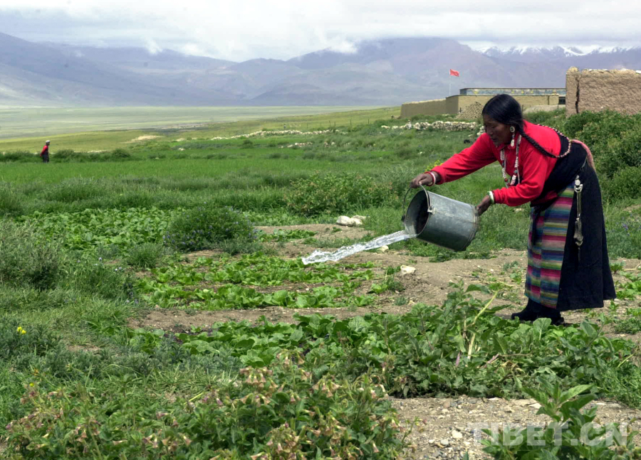 這是在尼瑪縣文部鄉(xiāng)南村的當惹雍錯湖畔,一位藏族婦女在為蔬菜澆水(唐召明2001年攝)