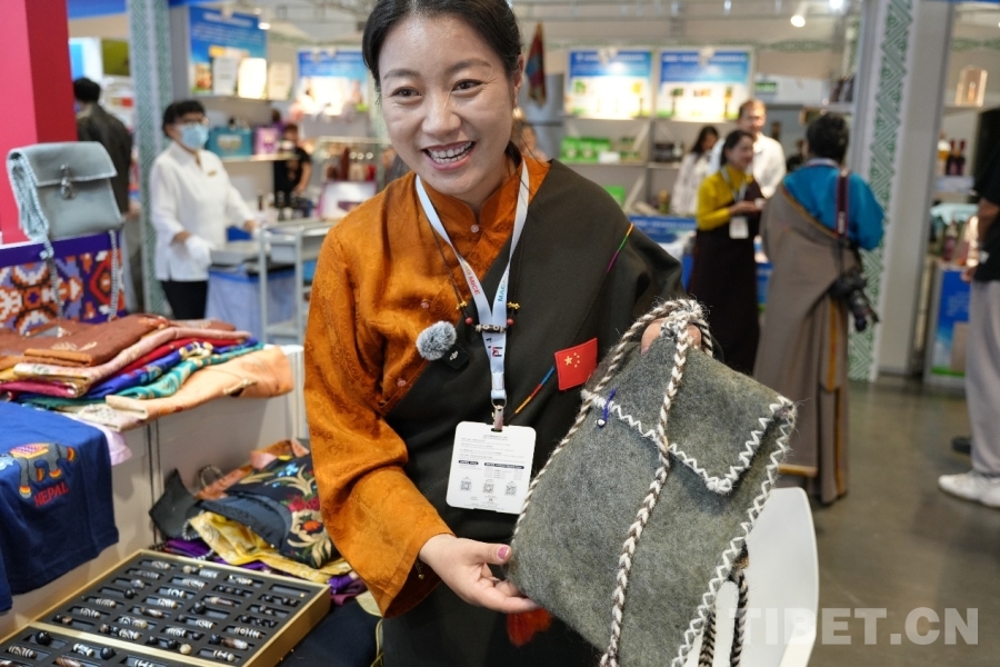 圖為周永拉毛正在展示藏族風(fēng)格挎包 攝影:楊柳青