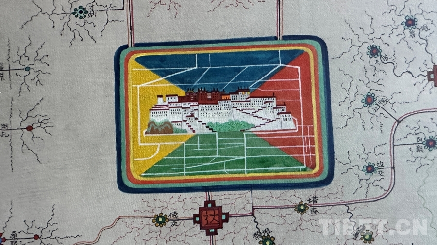達(dá)布詳細(xì)解釋了這幅唐卡的圖像系統(tǒng):正方形代表市、區(qū),內(nèi)部畫有該市區(qū)主干道地圖;十字方形代表縣;圓形寶石形代表鄉(xiāng)鎮(zhèn);藏文“嗡”字代表名勝古跡;此唐卡以黑線為所有公路基礎(chǔ)線,黑線邊上的紅黃線代表國道和高速,綠線代表省道,黑細(xì)線代表縣鄉(xiāng)鎮(zhèn)及村級公路。沿途還繪制了珠峰、古格王國遺址、納木錯等代表性景點,并用藏文標(biāo)注名稱。