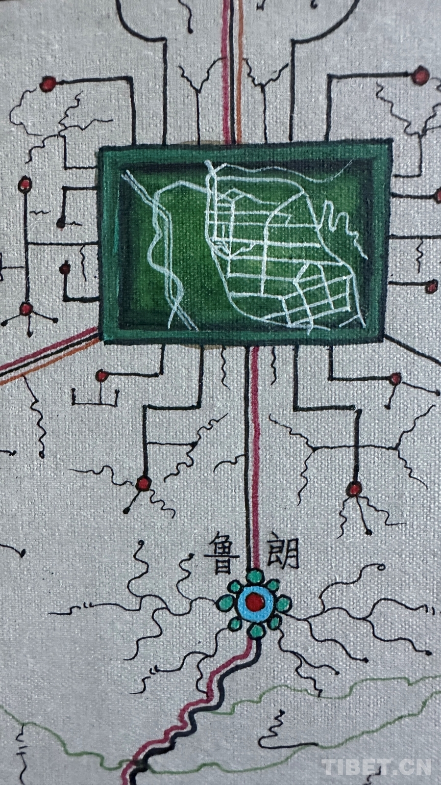 創(chuàng)作過程中最大的困難是如何藝術(shù)地表現(xiàn)公路網(wǎng)絡(luò)。“我通過分析現(xiàn)代地圖、衛(wèi)星導(dǎo)航、古代寶藏圖和手繪地圖,發(fā)現(xiàn)西藏公路是順應(yīng)地貌修建的?!边_(dá)布描述著他的發(fā)現(xiàn),“沿著河流,一條河有幾個分支就有幾條路;沿著山谷,一個大山谷有幾個小山溝就有幾條路。俯看就像一棵大樹,又像是電腦芯片,一條主干道邊上分出無數(shù)支線。”