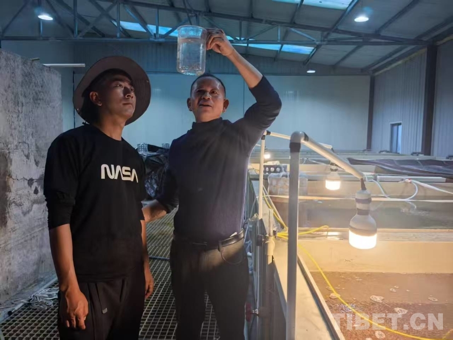 圖為駱明飛(右)帶徒弟尼瑪旺堆學(xué)習(xí)如何科學(xué)觀(guān)察魚(yú)苗的繁育過(guò)程 受訪(fǎng)者供圖