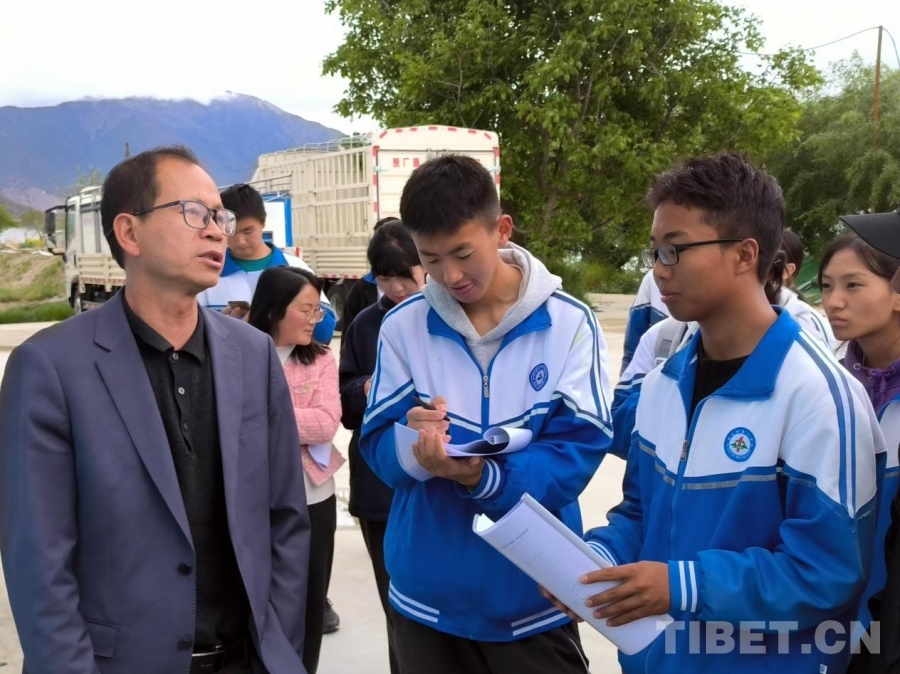 圖為駱明飛(左一)為林芝一中學(xué)生科普高原漁業(yè)知識(shí) 受訪(fǎng)者供圖
