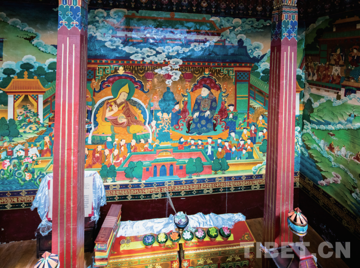 圖為五世達(dá)賴?yán)锕示觾?nèi)的壁畫——清順治皇帝接見五世達(dá)賴?yán)?/p>