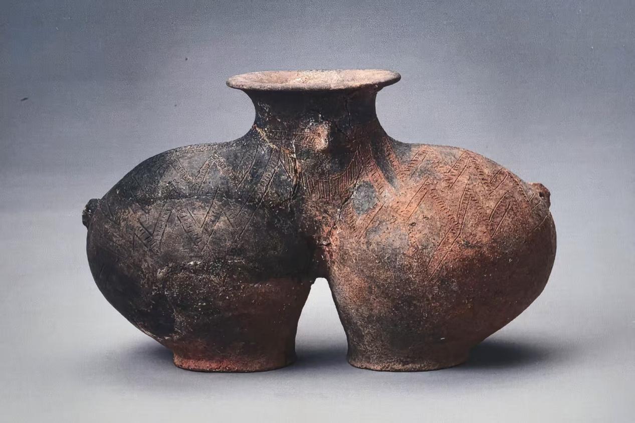 西藏昌都卡若遺址里出土了一只大約距今5000年的陶罐,它造型獨特、紋飾精美、色彩深邃,展現(xiàn)了高原先民極高的彩陶技藝,這便是如今西藏博物館的標(biāo)識原型——朱墨彩繪雙體陶罐。