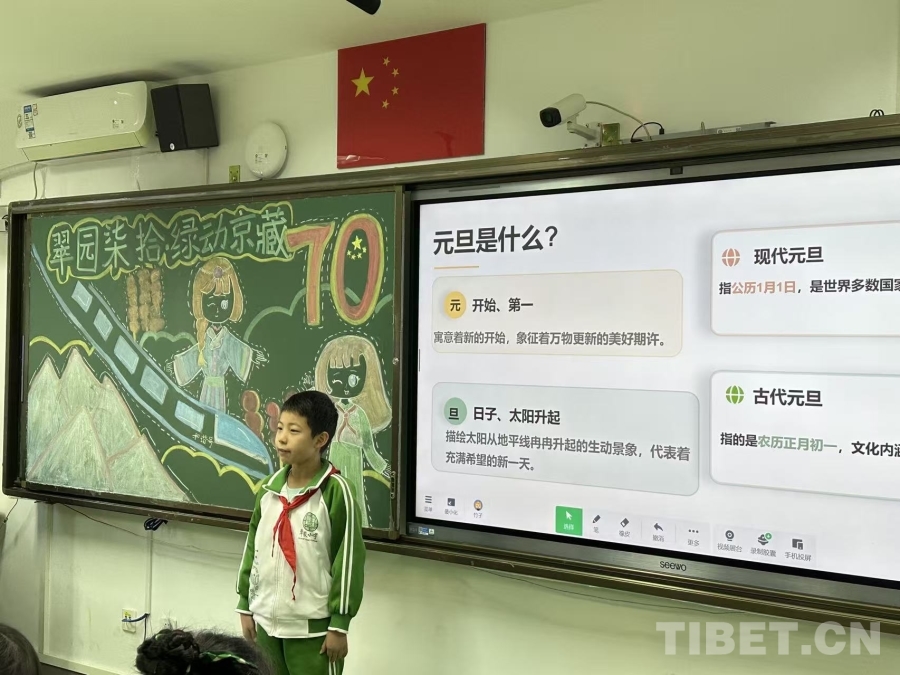 為了歡迎遠道而來的藏族小伙伴,翠微小學全體師生精心籌備了以“石榴花開別樣紅,民族團結一家親”為主題的系列交流活動。30日上午,一場特殊的聯(lián)合隊會拉開了深入交流的序幕。在隊會上,兩地孩子相互佩戴紅領巾、敬獻潔白哈達,以最莊重又親切的禮節(jié)表達彼此間的尊重與祝福。大家共同觀看回顧雙方從寫信相識到奔赴北京、準備禮物、期待相見的溫情短片,聆聽關于漢族元旦節(jié)日習俗和藏民族游牧文化的生動介紹,在增進了解中深化認同。