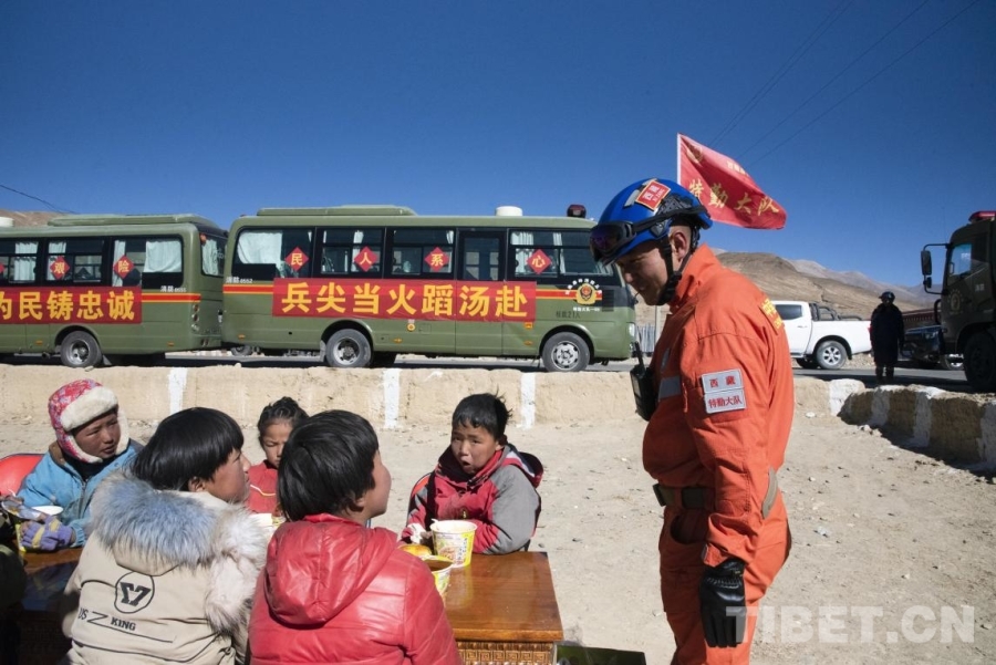 圖為在定日縣曲洛鄉(xiāng)措昂村受災(zāi)安置點,拉薩森林消防大隊為受災(zāi)小朋友搭建起的臨時“小飯桌”,為村中受災(zāi)群眾提供熱乎的便餐。(攝于2025年1月8日) 攝影:趙振宇