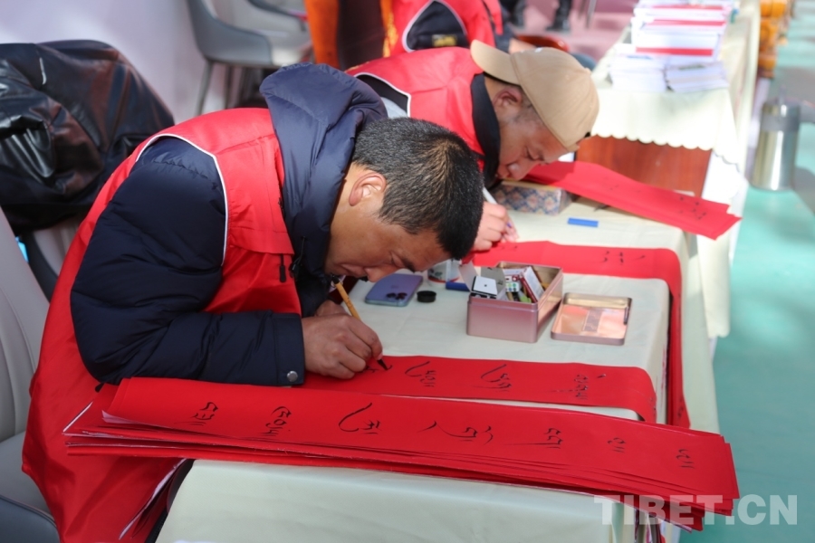 溫暖物資發(fā)放區(qū),保暖衣物、生活用品、學(xué)習(xí)用品等陸續(xù)送到群眾手中。書法老師現(xiàn)場揮毫,書寫一幅幅寓意吉祥的藏文春聯(lián)贈(zèng)予鄉(xiāng)親,為即將到來的新春增添濃濃年味與文化氣息。