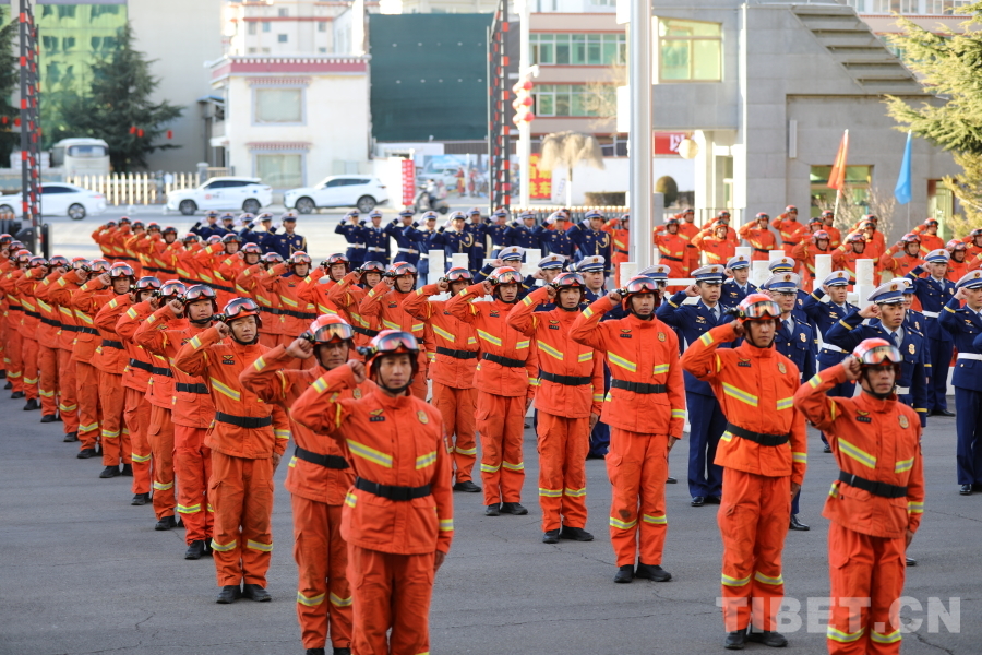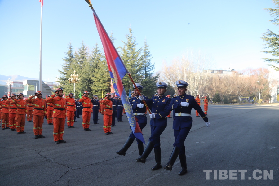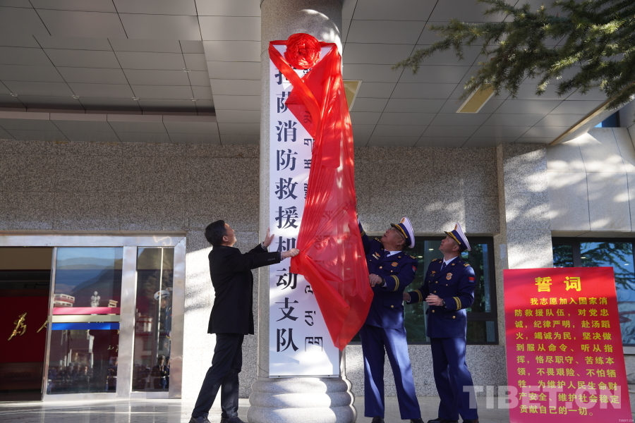 儀式在莊嚴(yán)的升國旗儀式中拉開序幕。雄壯的《義勇軍進行曲》響徹高原,鮮艷的五星紅旗冉冉升起,全體參會人員肅立注目、神情莊重,向國旗致以崇高敬意。升旗儀式結(jié)束后,相關(guān)領(lǐng)導(dǎo)共同為“拉薩消防救援機動支隊”揭牌,隨著紅綢緩緩落下,現(xiàn)場掌聲雷動,標(biāo)志著這支傳承高原火焰藍(lán)光榮傳統(tǒng)、肩負(fù)全新使命的救援機動隊伍正式組建成立。