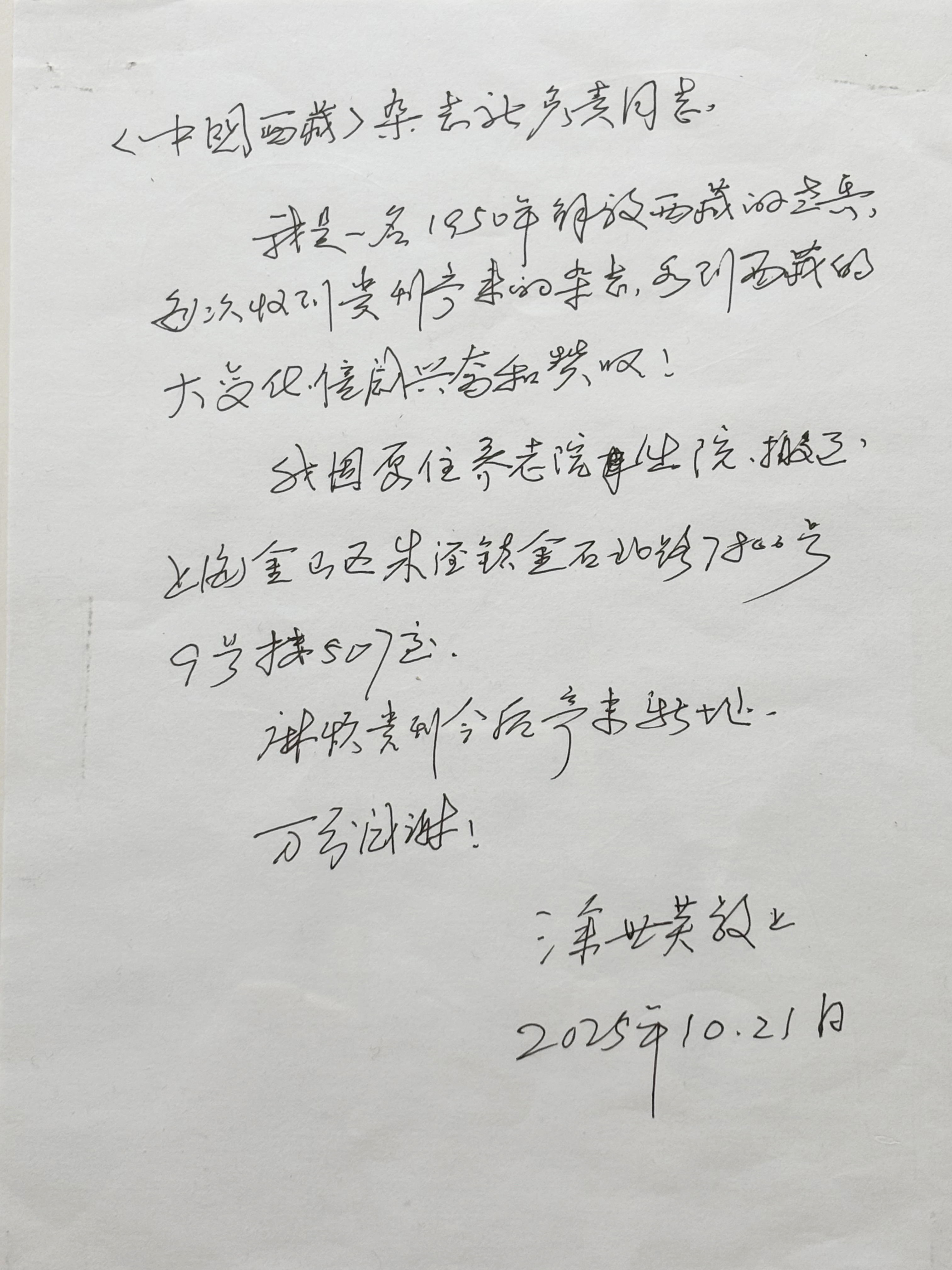 涂世英老先生,見字如面。您的來信,《中國西藏》雜志編輯部已完整收悉,心中滿是敬意與溫暖。我們深知,您是1950年便投身于解放西藏偉大事業(yè)的老兵,是雪域高原和平解放的親歷者、見證者,是用青春與熱血守護(hù)這片土地的先行者。歲月流轉(zhuǎn),您始終未曾放下對西藏的牽掛,每一次收到本刊,都為這片高原翻天覆地的變化感到由衷興奮和贊嘆。這份跨越時光的關(guān)注,讓我們每一位編輯都深受觸動。