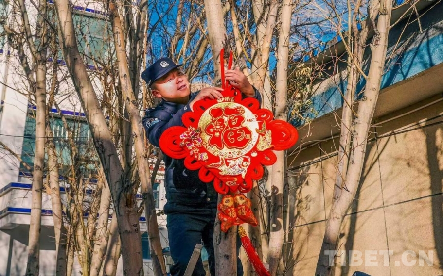 “來來來,搭把手!把這個(gè)中國結(jié)掛高點(diǎn),看著喜慶!” 教導(dǎo)員楊曦淙踩著凳子將手中的中國結(jié)高高地掛在了樹上,新警吳措多杰在下面扶著梯子,仔細(xì)調(diào)整著高度。另一邊,民警們?nèi)宄扇海械哪弥鴿{糊貼對(duì)聯(lián),有的忙著掛彩燈,營區(qū)的每一個(gè)角落都被點(diǎn)綴得喜氣洋洋。