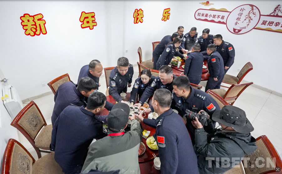 圖為扎西宗邊境派出所民警在餐廳聚餐,共度新春