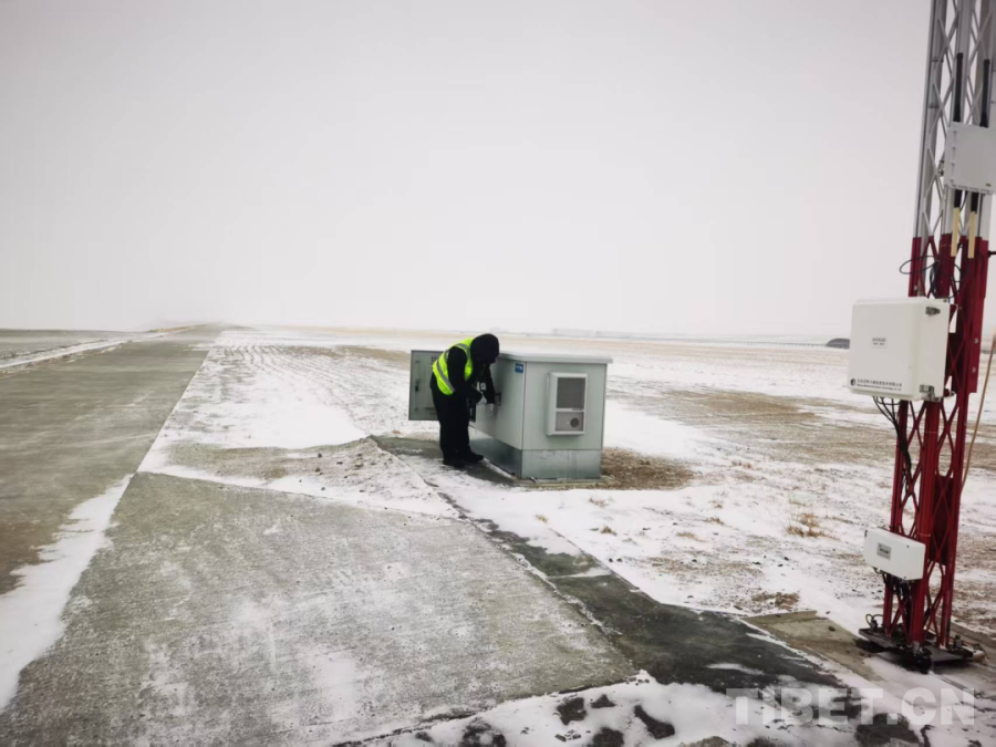 普蘭機場工作人員在風雪中維護跑道設備