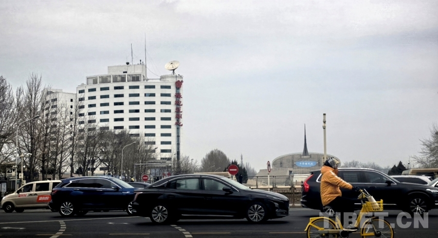 在北京西長(zhǎng)安街南側(cè)遠(yuǎn)眺2026年全國(guó)兩會(huì)新聞中心所在地梅地亞中心 攝影:劉莉