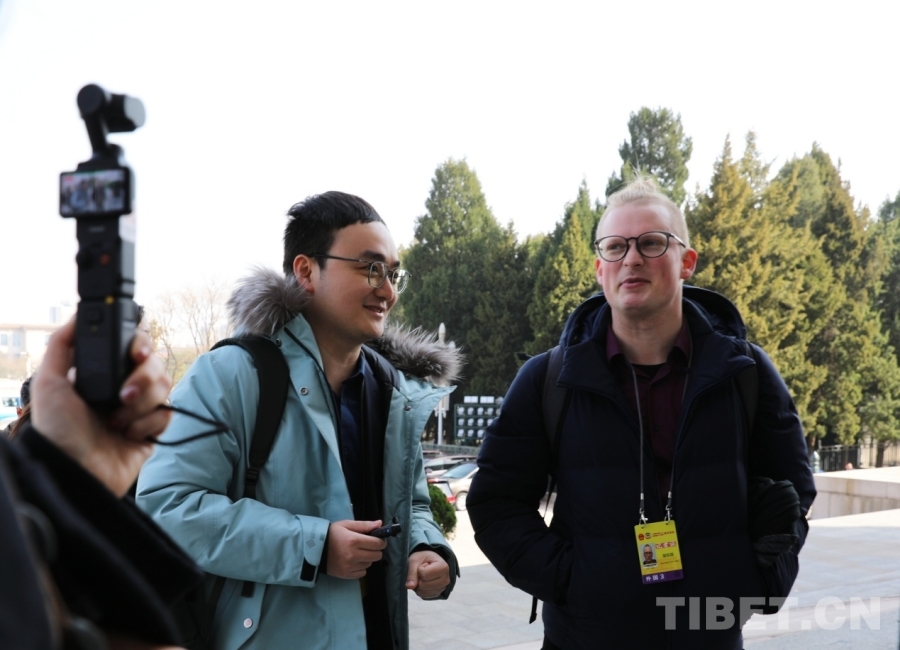3月3日下午,全國政協(xié)十四屆四次會議新聞發(fā)布會召開前,迪拜中阿衛(wèi)視駐華記者方浩明接受采訪。攝影:劉莉