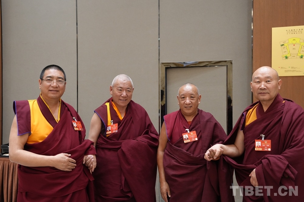 兩會喜相逢,多位宗教界政協(xié)委員在會議間歇合影留念,從左至右分別為:賽赤·確吉洛智嘉措、江白拉桑、扎西堅(jiān)才、桑杰·嘉措