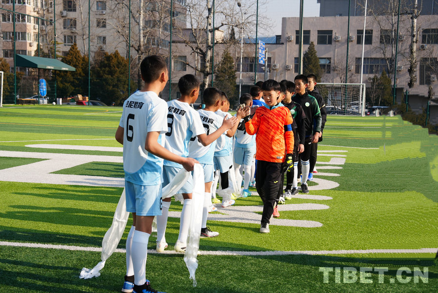 2025年12月29日,京藏少年開展足球聯(lián)誼賽,賽前擊掌,西藏青少年向?qū)Ψ角騿T獻(xiàn)哈達(dá)。攝影:宋俊