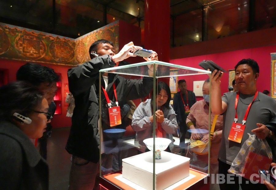 來(lái)自西藏各地的農(nóng)牧民合作組織帶頭人拍攝展品明宣德青花五彩滿池嬌圖靶碗。
