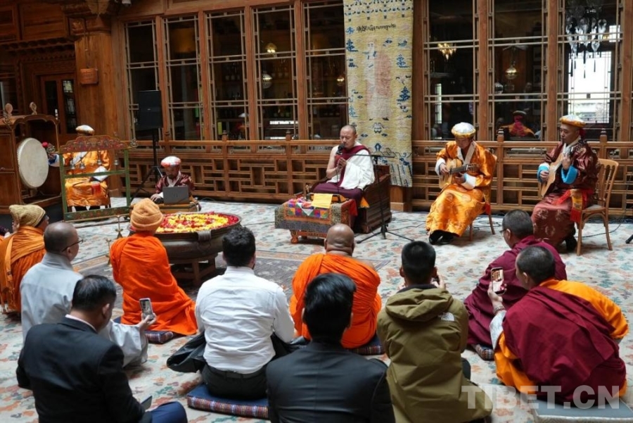 當(dāng)晚,參訪團(tuán)聆聽了中國(guó)非物質(zhì)文化遺產(chǎn)“古爾魯”道歌。該藝術(shù)第42代傳承人——羊日崗寺第七世帕洛活佛以搖鼗伴奏,旋律源于誦經(jīng)曲調(diào),悠揚(yáng)動(dòng)人。參訪團(tuán)成員們或靜心聆聽,或用視頻記錄下演奏的精彩時(shí)刻,完成了一次跨越語言與國(guó)界的音樂交流。