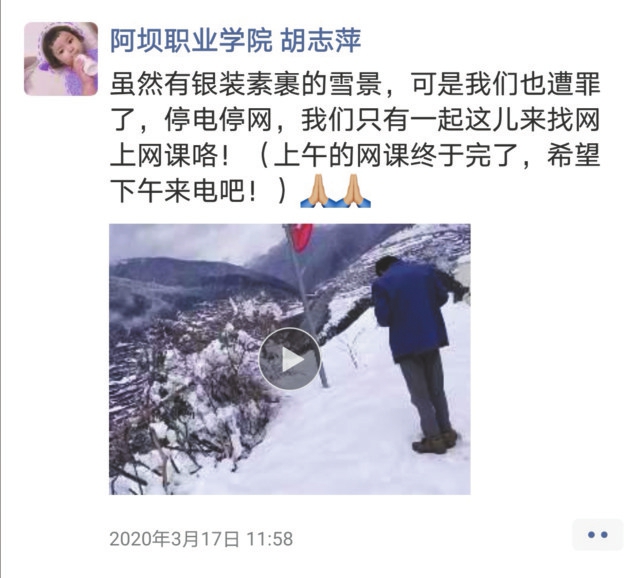 胡志萍是阿壩職業(yè)學院的大二學生,家住四川省阿壩藏族羌族自治州小金縣扶邊鄉(xiāng)高卡村。3月17日一早,胡志萍發(fā)現(xiàn),由于前一夜的大雪壓壞了線路,家里斷電斷網了。