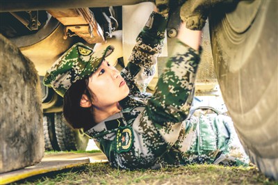 任務(wù)間隙,官兵們認真檢修保養(yǎng)車輛。喬可 攝