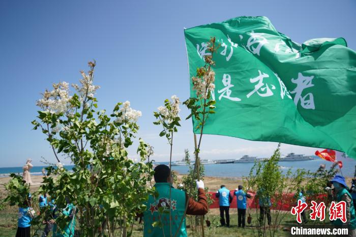 22日上午,200余名志愿者們在青海湖畔種植了丁香、榆葉梅和水栒子等適應青藏高原高寒氣候的耐寒、耐鹽堿樹種共300多棵。