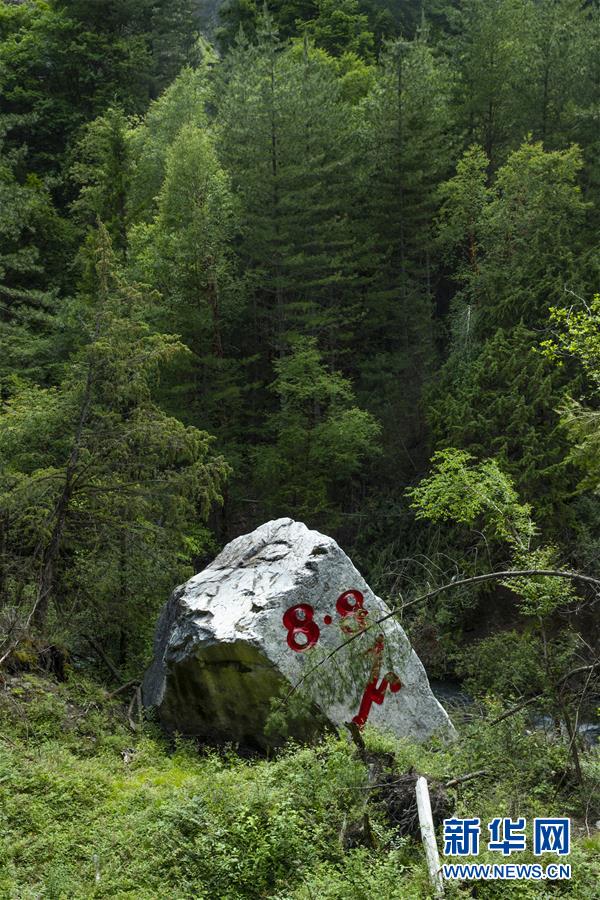 這是九寨溝風(fēng)景名勝區(qū)內(nèi)的“8·8石”(6月18日攝)。地震中,這塊高約9.2米、重約522噸的巨石從海拔2654米的山體滾落至河谷,垂直落差達272米。此石為白云質(zhì)灰?guī)r,形成于3.2億年前的海洋環(huán)境,見證了九寨溝的滄桑變遷。新華社記者 沈伯韓 攝