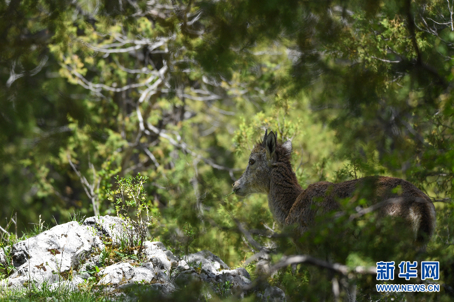 一只小巖羊在囊謙縣白扎鄉(xiāng)尕爾寺附近的山坡上覓食。(6月21日攝)新華網(wǎng) 潘彬彬 攝