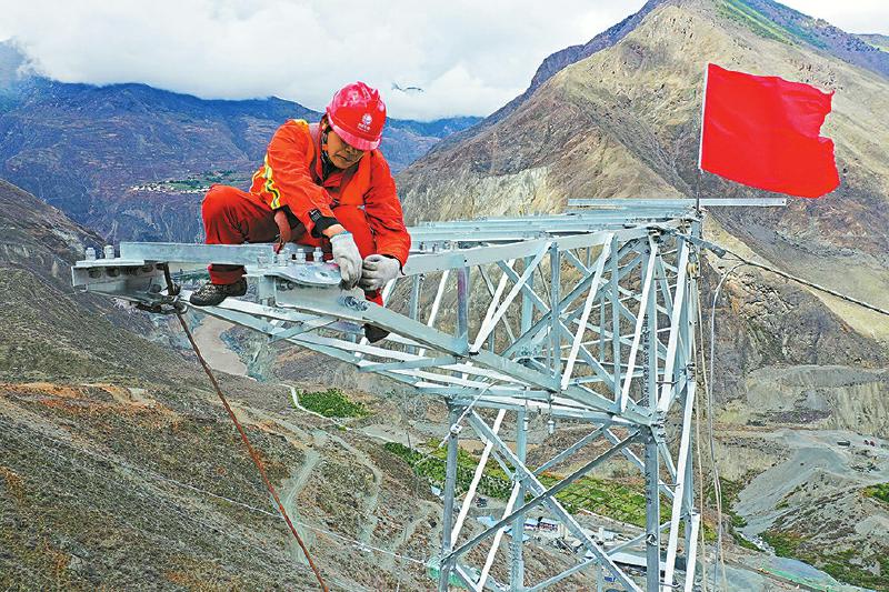 5月24日,甘孜州巴塘縣中咱-蘇洼龍35千伏線路工程78號塔放線現場,施工人員正在塔上進行放線作業(yè)。