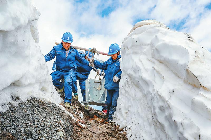 6月10日,阿壩州理縣夾壁—馬塘110千伏輸變電工程,建設者靠人力抬起沉重的塔材,艱難穿過高達2米的雪墻,前往組塔點位。