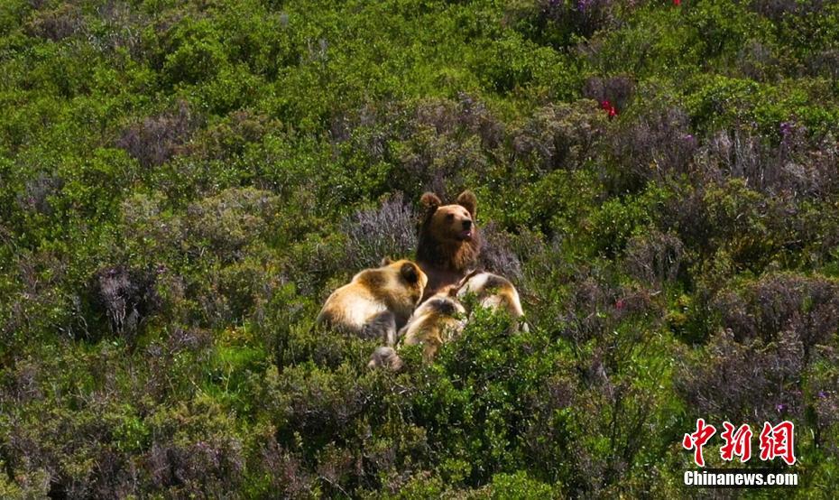7月13日下午,記者下鄉(xiāng)采訪途中,在海拔4500米的四川省甘孜藏族自治州石渠縣蒙宜鎮(zhèn)蒙格村附近一處水草豐茂的山坡處拍攝時(shí),偶然發(fā)現(xiàn)一只棕熊媽媽曬著陽光浴給三只小熊喂奶場景,棕熊媽媽喂奶結(jié)束后領(lǐng)著小熊寶寶們緩慢走向大山深處。