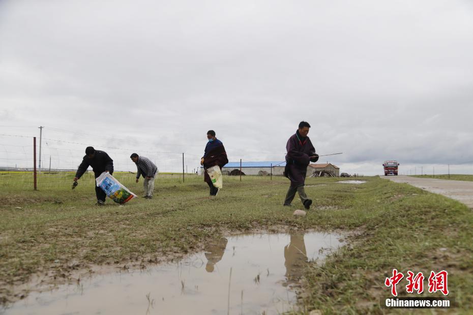 7月21日,青海省海北藏族自治州剛察縣伊克烏蘭鄉(xiāng)剛察貢麻村的仁增才讓(左)、吉科加(中)、萬(wàn)瑪扎西(右)協(xié)力撿拾草場(chǎng)垃圾。2008年,萬(wàn)瑪扎西路在村支書(shū)的支持下,與索南木旦巴、仁增才讓、吉科加三個(gè)人組建了義務(wù)環(huán)保隊(duì),自此一干就是12年。他們?cè)趽焓袄耐瑫r(shí)進(jìn)行著環(huán)保宣傳,希望從源頭減少垃圾。仁增才讓說(shuō):“現(xiàn)在草原上的垃圾幾乎是看不到了。”中新社記者 馬銘言 攝