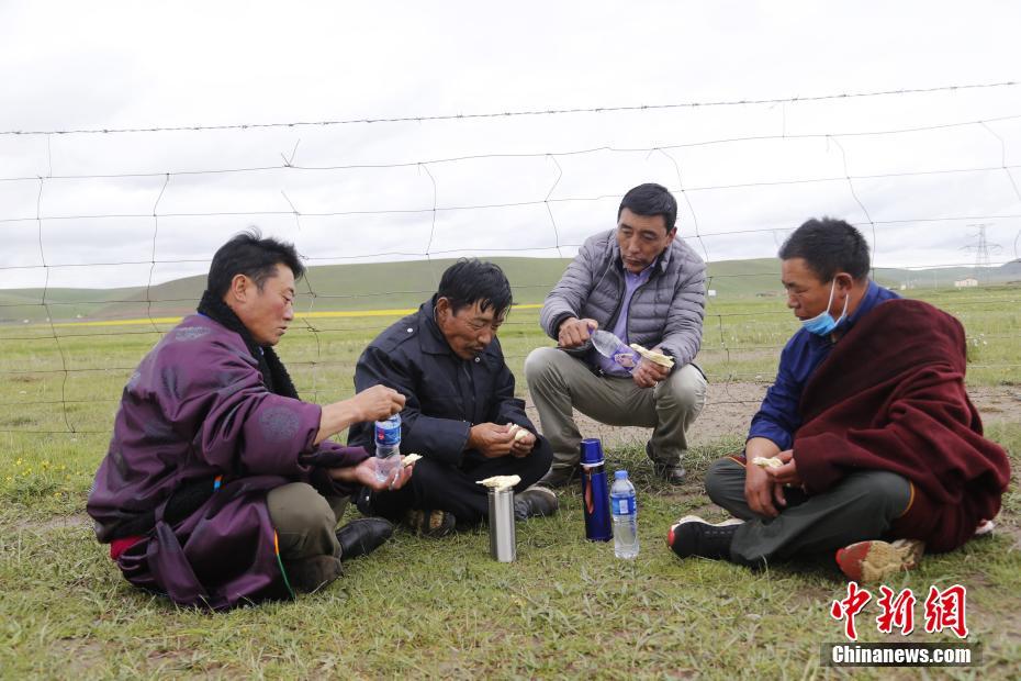 7月21日,青海省海北藏族自治州剛察縣伊克烏蘭鄉(xiāng)剛察貢麻村的索南木旦巴(左一)、仁增才讓(左二)、吉科加(右二)、萬(wàn)瑪扎西(右一)四人在撿拾著草場(chǎng)垃圾途中,吃餅子,喝礦泉水充饑。2008年,萬(wàn)瑪扎西路在村支書(shū)的支持下,與索南木旦巴、仁增才讓、吉科加三個(gè)人組建了義務(wù)環(huán)保隊(duì),自此一干就是12年。他們?cè)趽焓袄耐瑫r(shí)進(jìn)行著環(huán)保宣傳,希望從源頭減少垃圾。仁增才讓說(shuō):“現(xiàn)在草原上的垃圾幾乎是看不到了?!敝行律缬浾?馬銘言 攝