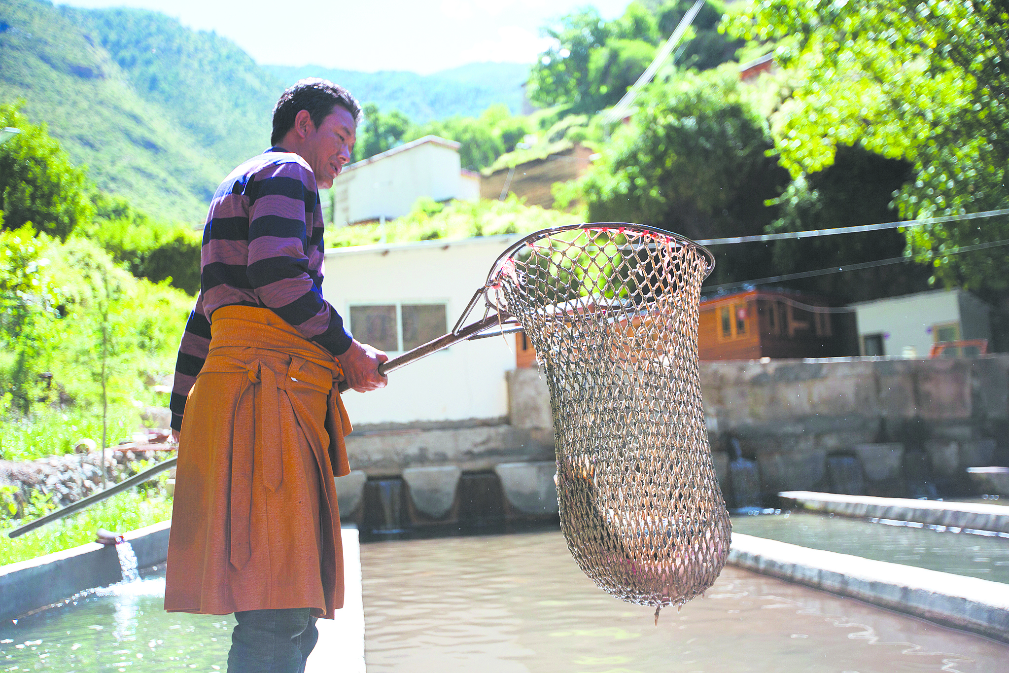在成品魚池前,38歲的藏族老鄉(xiāng)彭錯(cuò)正拿著網(wǎng)兜撈魚。今天有買家來(lái)看魚,他負(fù)責(zé)撈幾條樣品給人看。用攔截網(wǎng)片把魚群逼到狹窄的水道內(nèi),彭錯(cuò)熟練地拿起網(wǎng)兜在水中一攪,兩條肥碩的裂腹魚從水塘中一躍而起,褐色的鱗片在陽(yáng)光下閃閃發(fā)光。彭錯(cuò)不慌不忙,牢牢把住網(wǎng)兜左右一揮,兩條大魚便被捕入網(wǎng)中。“至少有三四斤重,肉質(zhì)緊實(shí),品質(zhì)很不錯(cuò)!”趕來(lái)查看的買家一邊抓魚一邊夸贊。