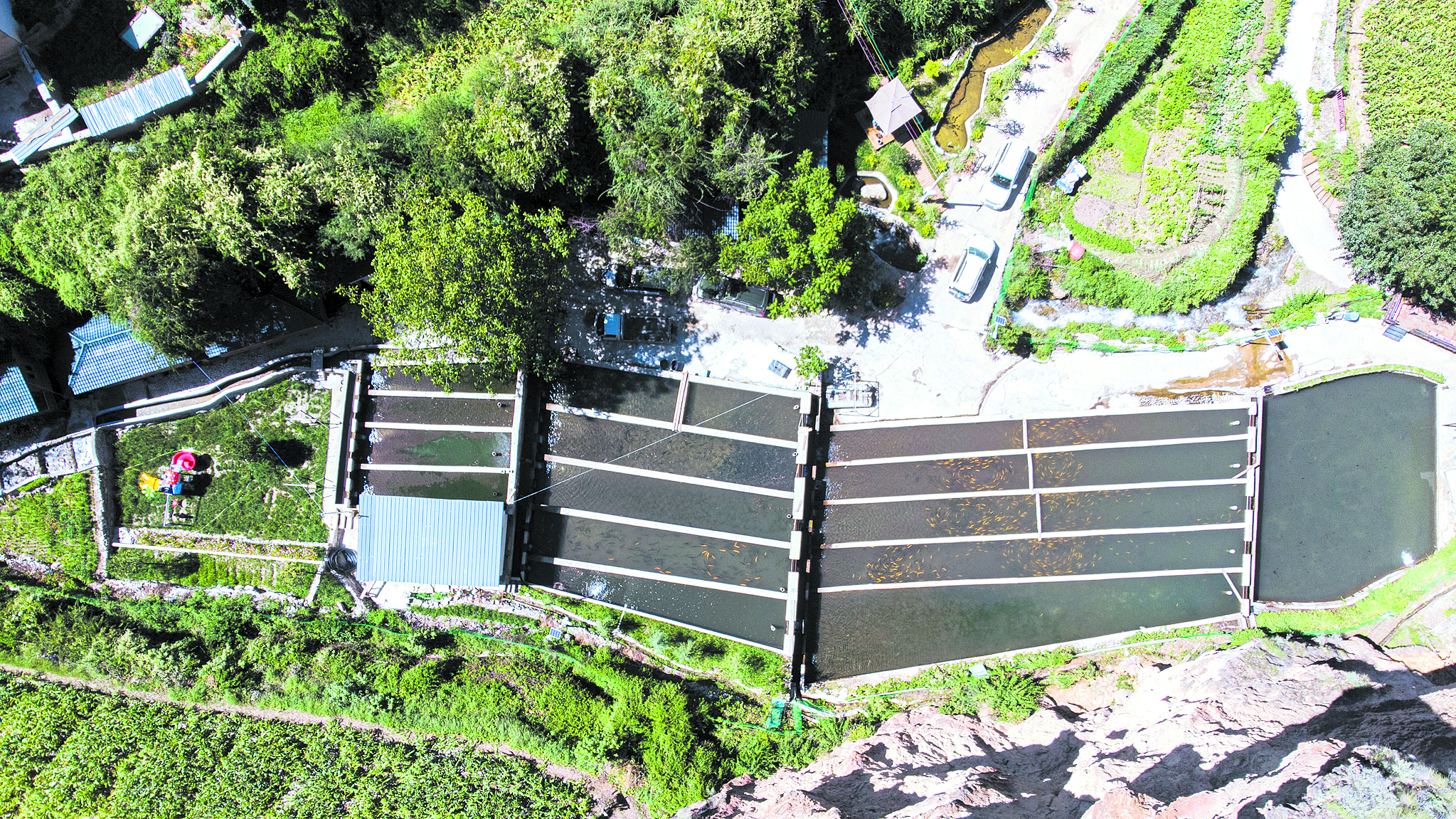 采訪車沿215國(guó)道在山谷間蜿蜒,定曲河水碧藍(lán)清亮。從莫木溝一路翻山而上,快到山頂時(shí),一座高山冷水魚養(yǎng)殖魚場(chǎng)呈現(xiàn)眼前。