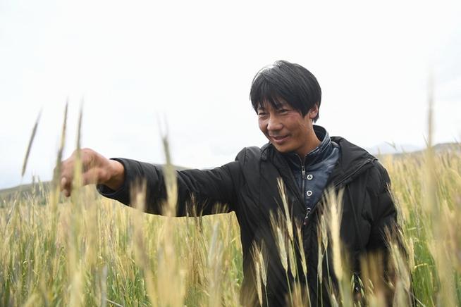 格多村村民藏木改查看飼草種植基地黑麥的長勢。新華網(wǎng) 潘彬彬 攝
