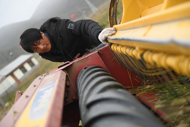 格多村村民藏木改對收割機(jī)進(jìn)行檢查,準(zhǔn)備收割。新華網(wǎng) 潘彬彬 攝