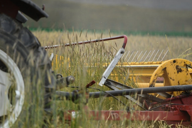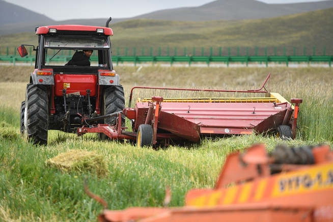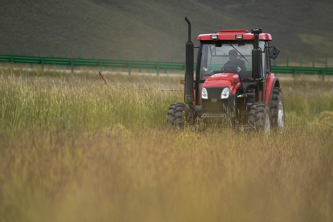 格多村村民藏木改駕駛收割機(jī)收割飼草種植基地的黑麥。新華網(wǎng) 潘彬彬 攝