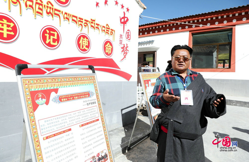 瑪沁縣拉加鎮(zhèn)贊根村的工作人員介紹專項(xiàng)工作組的情況。攝影:孫磊