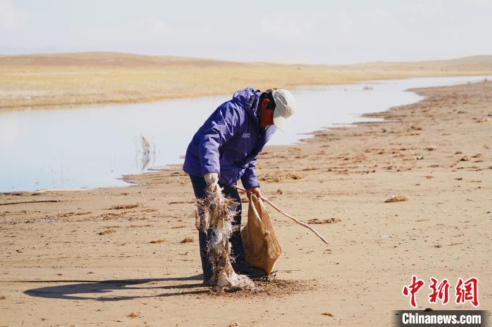 圖為牧民巡護隊隊員在青海湖畔撿垃圾。 文思睿 攝