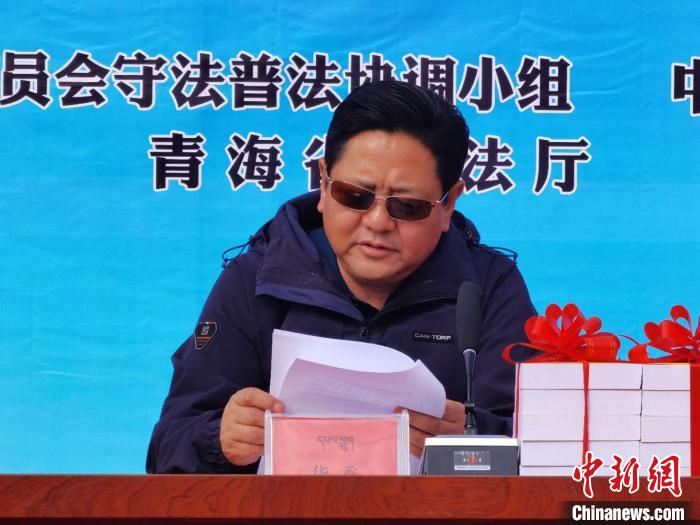 圖為青海省委統(tǒng)戰(zhàn)部副部長華秀宣讀《關于成立青海省宗教活動場所法治宣講團的通知》。潘雨潔 攝
