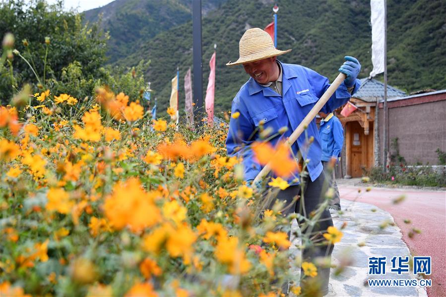 一名工人在甘南藏族自治州迭部縣電尕鎮(zhèn)謝協(xié)村村道旁的花壇干活(10月14日攝)。 新華社記者 陳斌 攝