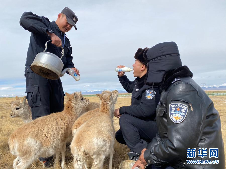 12月7日,在給藏羚羊幼仔喂奶前,可可西里索南達杰保護站站長趙新錄(中)用嘴測試奶溫。新華社記者 王金金 攝