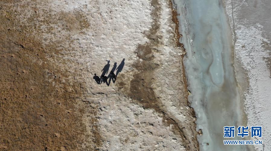 12月7日,站長趙新錄(中)與隊友鄧海平(左)、達才在可可西里索南達杰保護站管護區(qū)域內(nèi)巡查(無人機照片)。新華社記者 王艷 攝